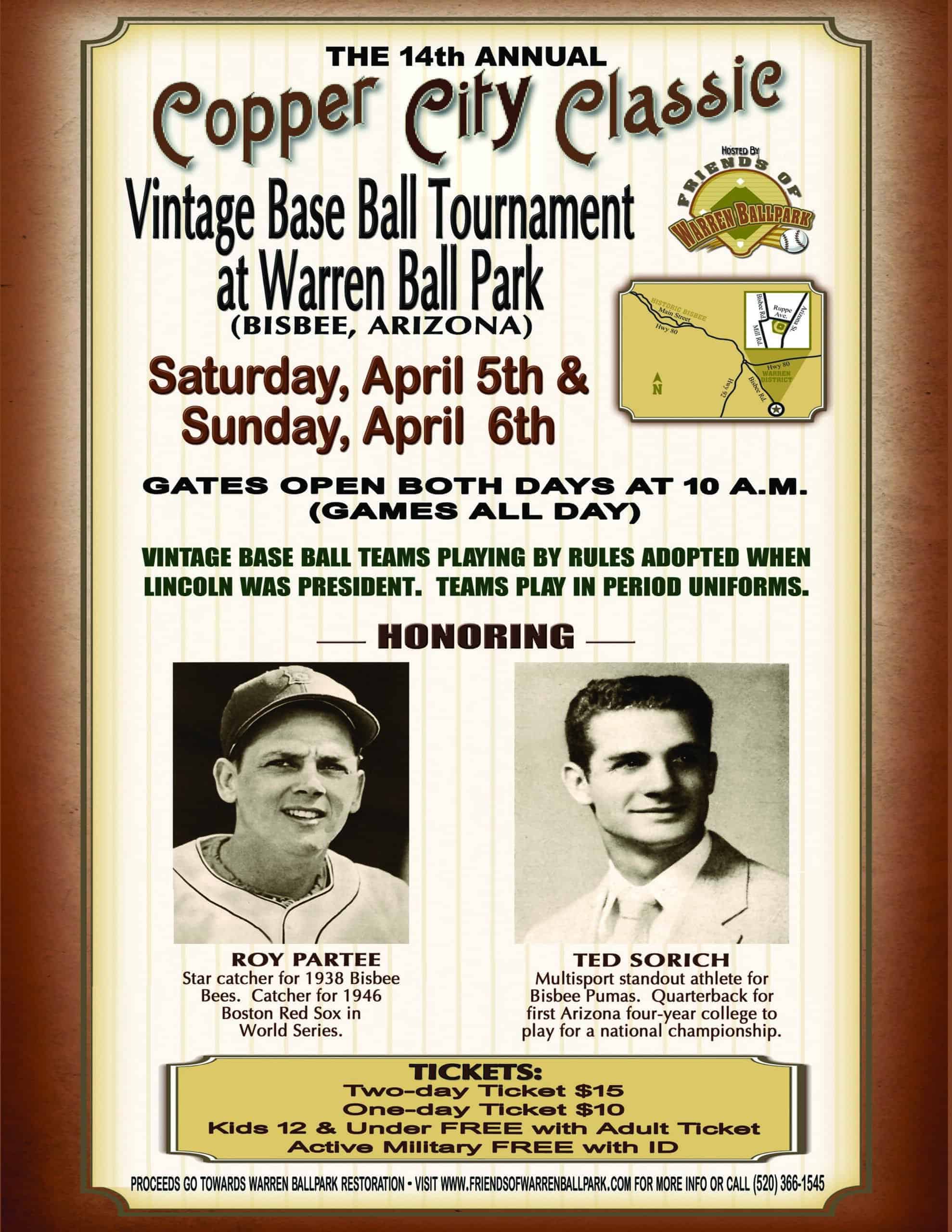 Vintage base ball returns to Bisbee’s historic Warren Ballpark April 5th and 6th. Teams from Bisbee, Tucson, Colorado, California and the Phoenix metro area take to the field to play in the 14th Copper City Classic Vintage Base Ball Tournament at Bisbee’s 116-year-old Warren Ballpark.